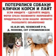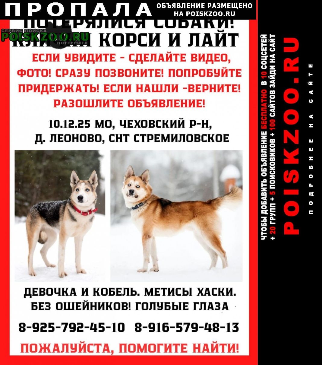 10 декабря в Чеховском районе возле деревни Леоново убежали две собаки. Мальчик и девочка метисы хаски с голубыми глазами, без ошейников.