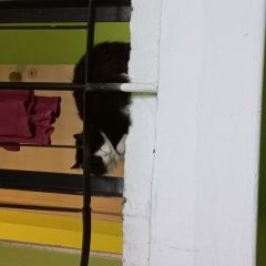 В подъезде обнаружена кошка. Черная с белым на морде и груди. Испуганная. На контакт не идёт. Второй день находится. Никому в доме не принадлежит.