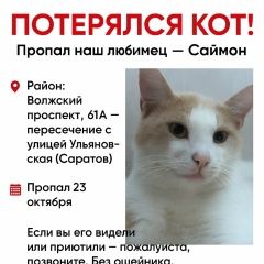 Потерялся кот Город Энгельс Ул волжский проспект 61а С пересечением улицы Ульяновская Окрас бело рыжий Грудка белая Хвост рыжий Кличка Саймон Боится шума На Шеи коричневый поводок Номер для связи..