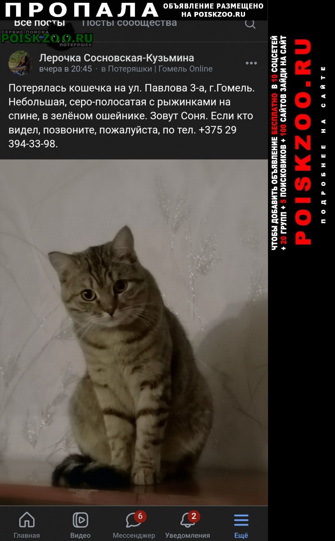 Потерялась кошечка на ул. Павлова 3-а, г. Гомель. Небольшая, гладкошерстная, серо-полосатая с рыжинками на спине, в зелёном ошейнике. Зовут Соня. Может быть в подвале. Если кто видел, позвоните, пожалуйста, по тел..