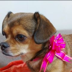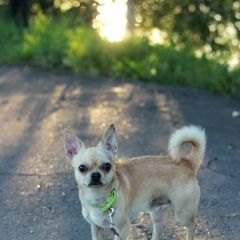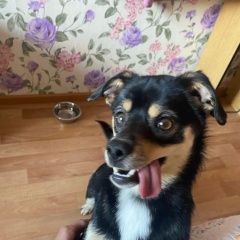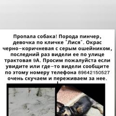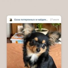 Порода чихуахуа. Окрас чёрно-подпалый (чёрно-коричневый). Кличка Рики. Была в шлейке фиолетового цвета. Потерялась 27 июля на территории Ботанического сада ИГУ. 30 июля, утром, была замечена на территории Южных..