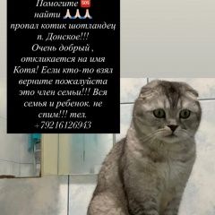 Просим помощи в поиске котика по кличке Котя. Пропал в поселке Донское, очень добрый, шотландский веслоухий.