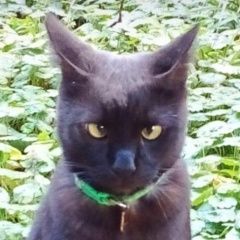Потерялся чёрный котик. Пугливый, на руки не идёт. Гладкошерстный, был зелёный ошейник с номером телефона. Глазки зелёные, чуть косенькие
