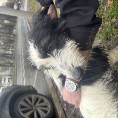 16. 04 Москва, Академический район. Новочеремушкинская улица. Найдена собака. Белая с черным. Среднего размера. Девочка. Голубой ошейник. Часть поводка оборвана. Ищем хозяев..