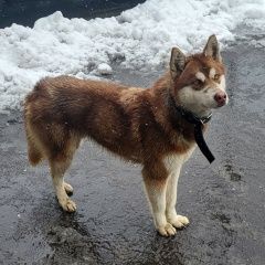 Хаски рыжий кобель, глаза желтые. Умная, контактная. В ошейнике. Метро б-р Рокоссовского в р-не ЧМТЗ