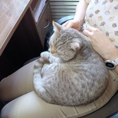 Явно домашний котик, охотно идёт на руки. Окрас светло серый с пятнами, спина и хвост с бурым оттенком. Синий ошейник.