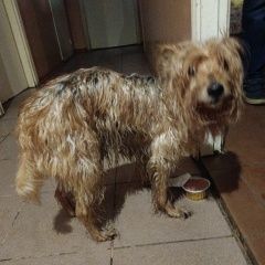 Найдена собака, метис йоркширского терьера. Ласковая. На шее ошейник-цепочка.