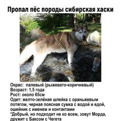 27. 09. 2020 утром в пос. Терскол в лесу за рекой Гарабаши убежал кабель хаски по кличке Саян, 2 года, окрас светлый. Особые приметы: глаза разные (голубой и карий); у переносицы одна полоска серого цвета, второй..