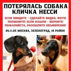 ПРОПАЛА СОБАКА С 17. 11 по 24. 11, Зеленоград, 16й район, корпус 1621. СИГНАЛ - 29. 11. Похожая такса была замечена у корпуса 1606  в интервале с 15 до 16 часов Пропала карликовая такса, девочка, кличка Несси. На момент пропажи была в кофточке, как на фотографии (могла слететь ). Пожалуйста, ВНИМАТЕЛЬНО ОСМОТРИТЕСЬ во дворах, под машинами, в подъездах и подвалах - на стрессе собака могла спрятаться в любом месте. Поделитесь информацией во всех местных чатах и пабликах Зеленограда Собака может быть сильно напугана, поэтому может не подходить к незнакомцам. Если видели или увидите собаку, пожалуйста, не гонитесь за ней, чтобы не спугнуть, а просто следите и сразу звоните. ПОЖАЛУЙСТА, ПОМОГИТЕ НАЙТИ СОБАКУ СДЕЛАЙТЕ РЕПОСТ